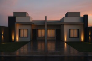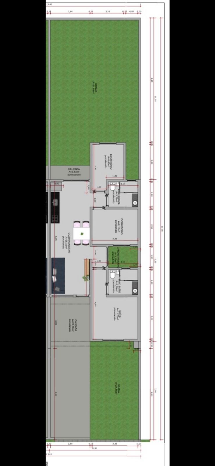 Casa geminada com 68,92 m² de área construída, implantada em um lote de 6,50 metros de frente por 30 metros de comprimento, oferecendo um quintal amplo e bem distribuído.
